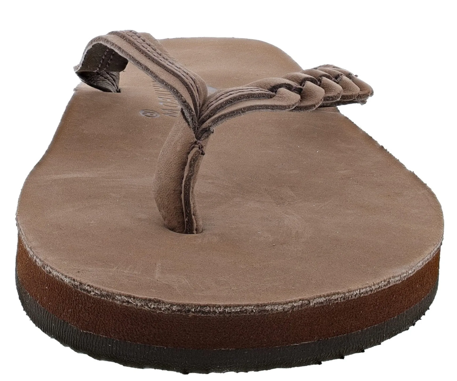 The narrow strap has an asymmetrical design featuring a braid on the outside straps and top stitched leather trim on the inside straps. The toe piece is our new V style construction and is wrapped with soft leather for comfort. The right sandal proudly displays the Original Rainbow woven label.
