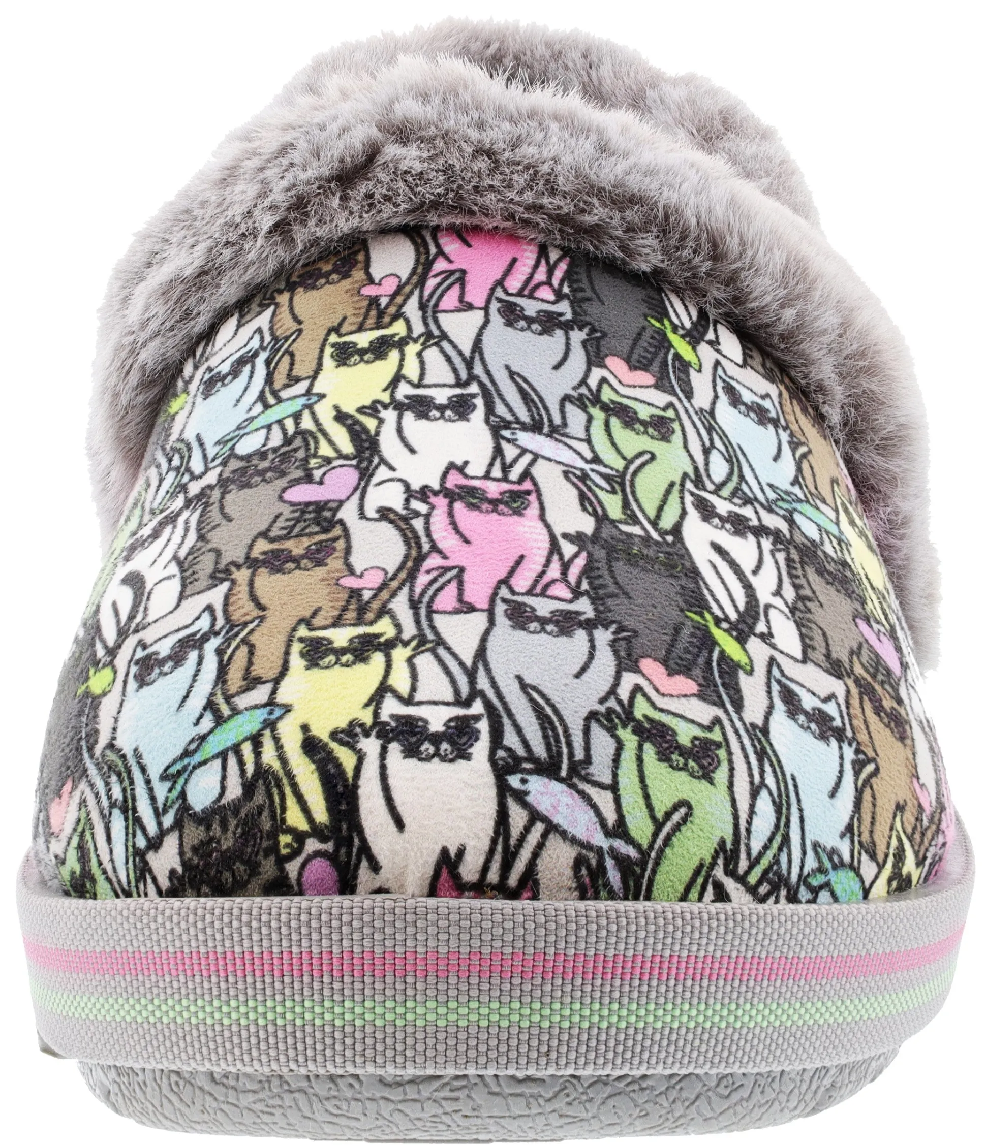 Curl up with your furry friends this season in BOBS from Skechers Too Cozy – Kitten Gloves. This casual ladies Bobs Skechers slipper features a soft microfiber suede-textured upper with an allover ‘Lover Girl’ colorful cat print, faux-fur lining and trim, plus a cushioned Bobs Skechers memory foam footbed. For every BOBS purchase, a donation is made to animals in need. Skechers Bobs meow slippers