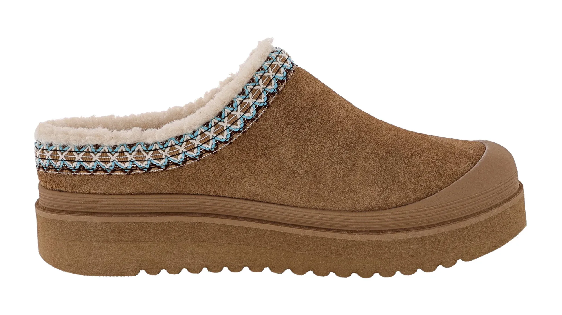 Treat your feet to chic comfort with BOBS from Skechers Dakota. This casual slipper clog features a 3M Scotchgard treated suede upper with faux shearling lining, intricate collar webbing, and a Skechers Memory Foam footbed for plush support.